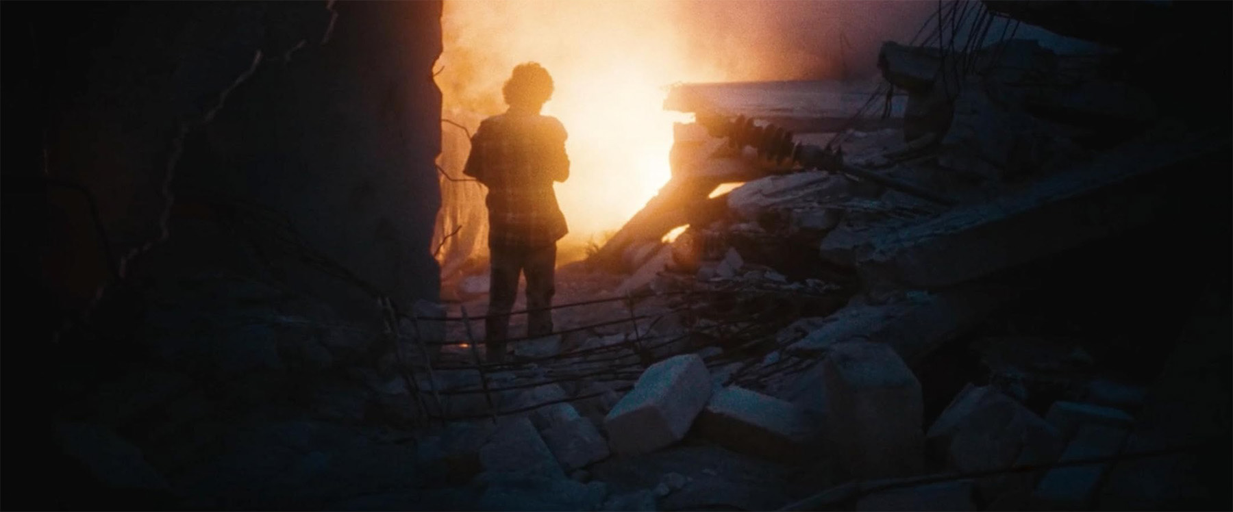 A sound comes from the left side. The sound isn't clear, but it is clearly a human voice, a female voice. She is struggling under the heavy walls that have fallen over her. Streams of blood are running over her dust covered face, but her eyes are still open and sharp. She is pushing something out of the rubbles, something she has been trying to protect with her body. We see a little BABY, a new-born covered in blood and dust.